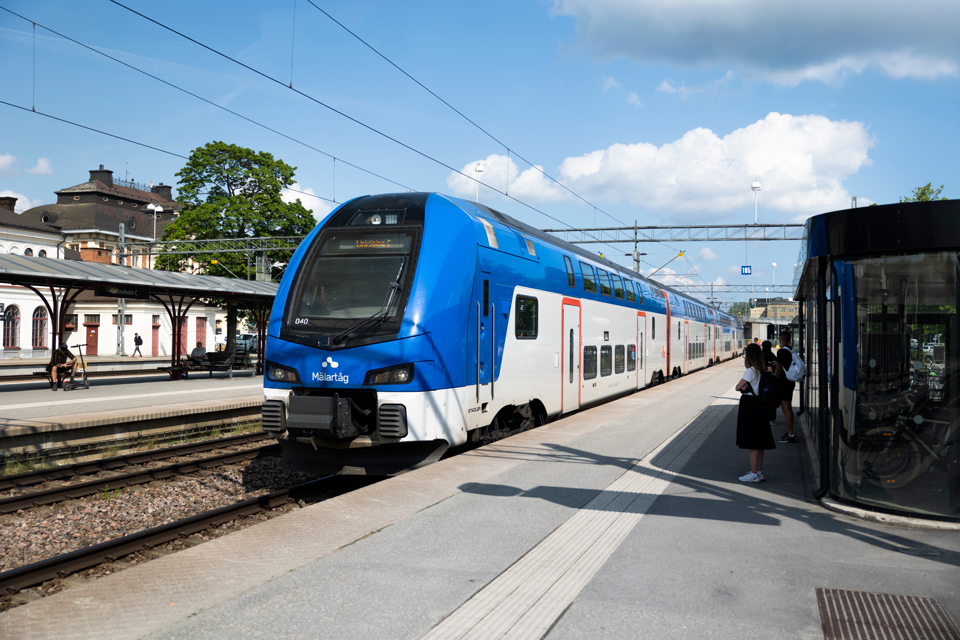 Ett Mälartåg som kör in på en tågstation