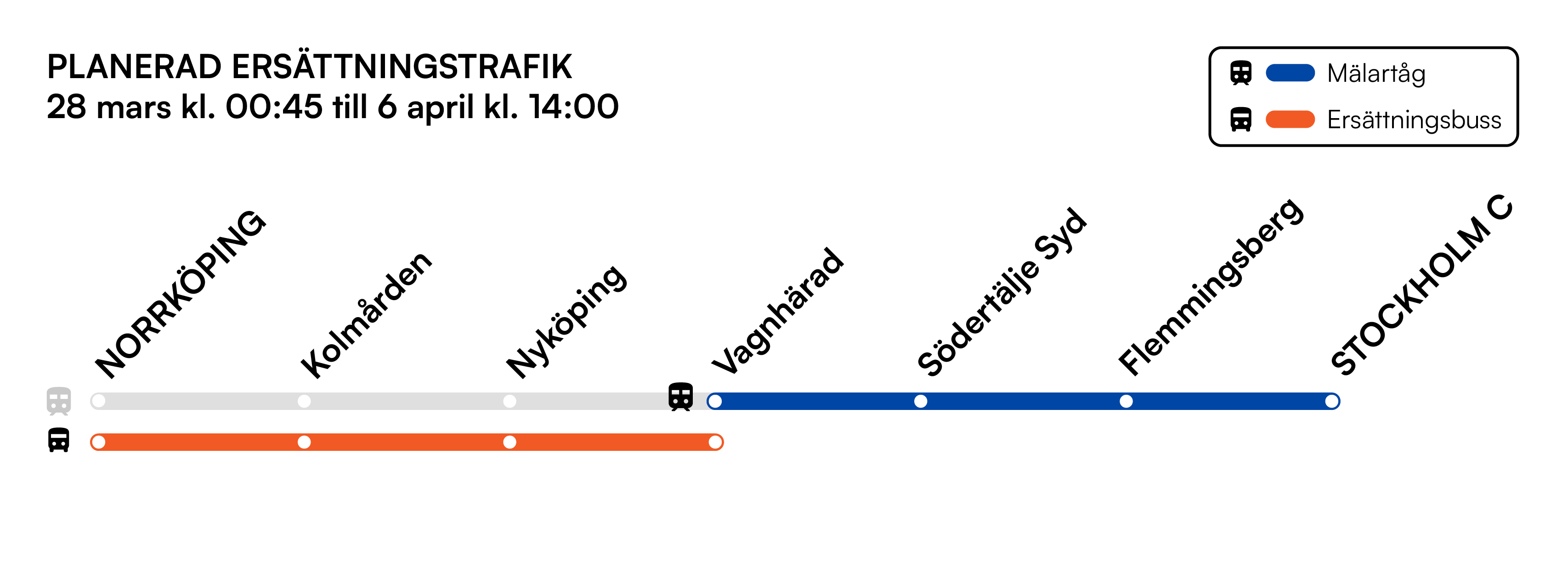 Tåg ersätts med buss på sträckan Norrköping–Nyköping–Vagnhärad. Byte till/från tåg i Vagnhärad. Undantag är två avgångar där buss ersätter till Södertälje Syd, se reseplanerare. I rusningstid på vardagar i påskveckan, 30 mars–2 april, förstärks busstrafiken mellan Nyköping och Vagnhärad,