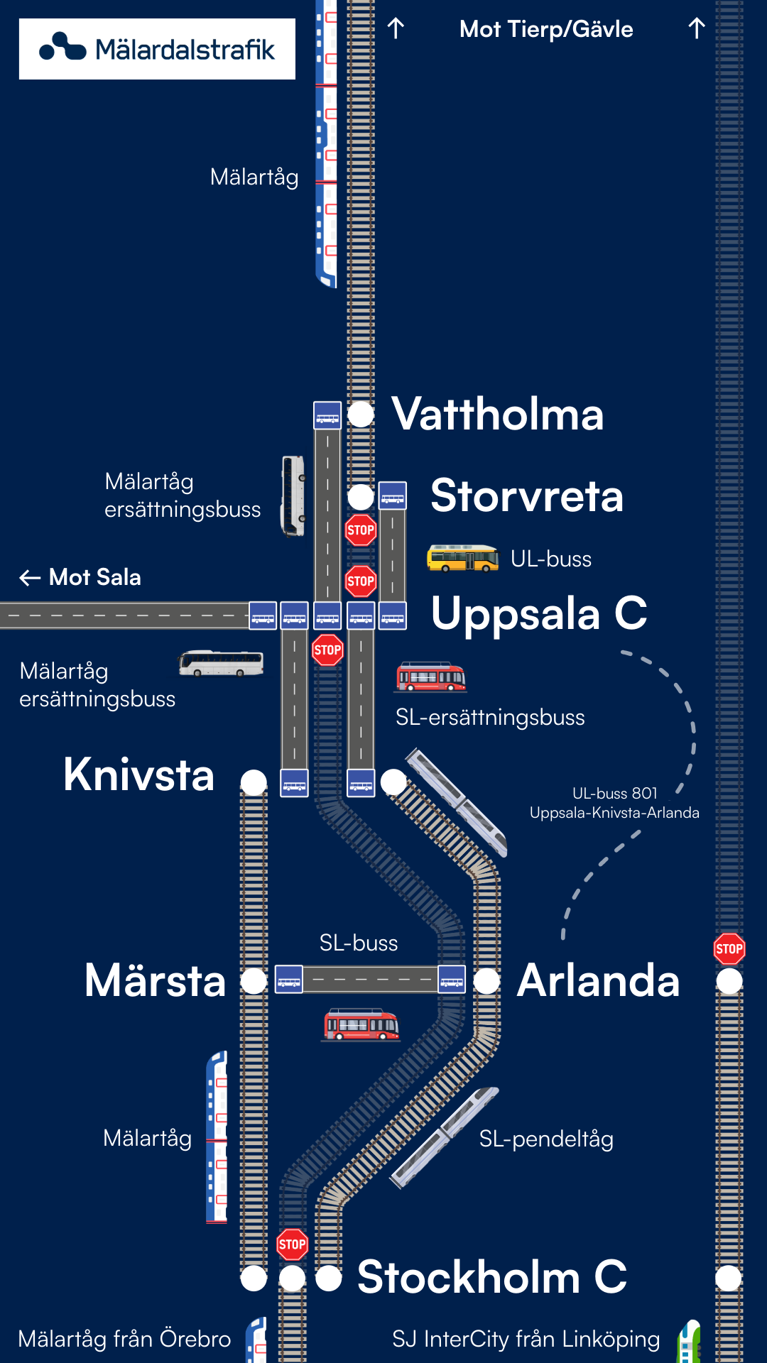 - I Knivsta: Ersättningsbussar för Mälartåg och SL avgår från tillfällig hållplats på Apoteksvägen nära stationen – följ skyltning som SL sätter upp.